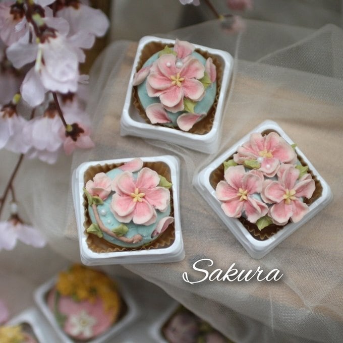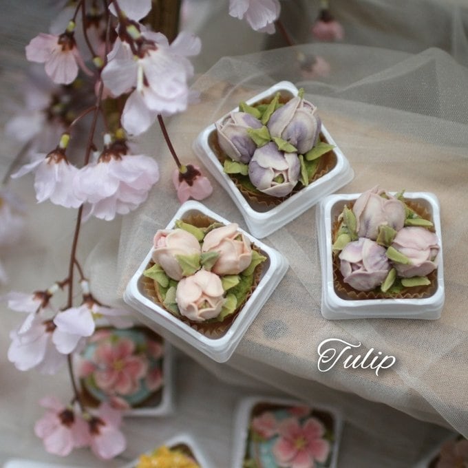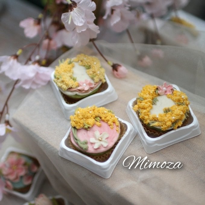 ミモザ、チューリップ、桜のあんフラワーです。