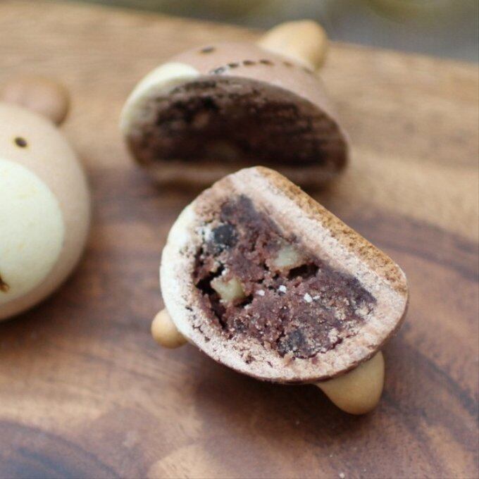 原材料名:白あん、アーモンドプードル、着色料、アラザン、カカオパウダー、コーヒー粉末、チョコチップ、塩、ベーキングパウダー、練乳、かぼちゃパウダー、ビートパウダー、着色料、こしあん、くるみ、黄な粉、小麦粉、砂糖、マーガリン、卵、バター、膨張剤、香料